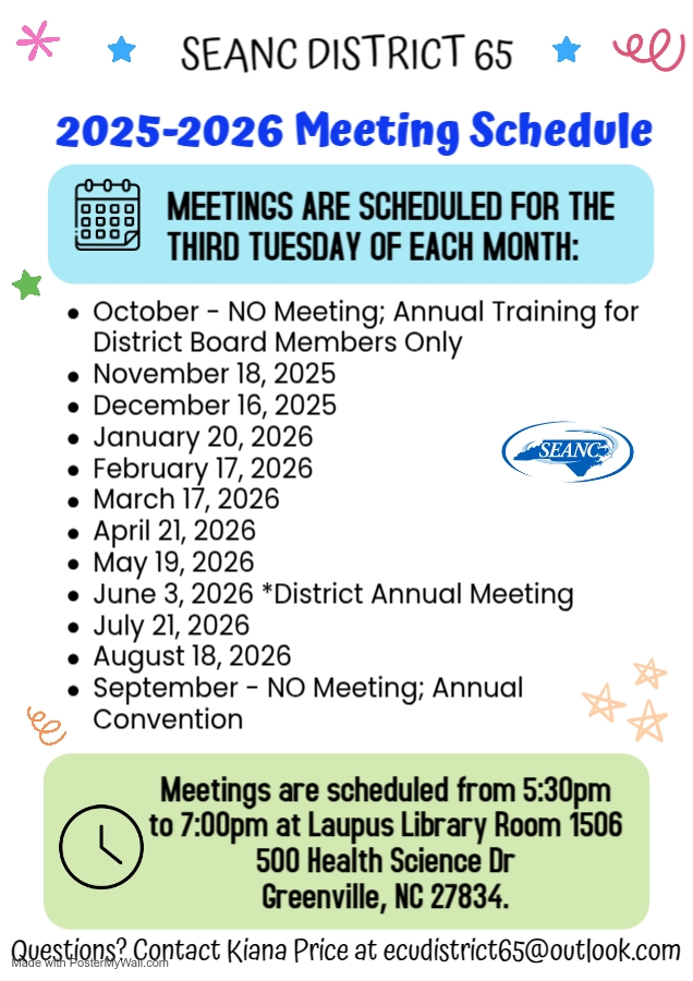 The SEANC District 65 Executive Board meets the third Tuesday of every month at 5:30 pm in Greenville at the Laupus Library, 500 Health Science Drive.