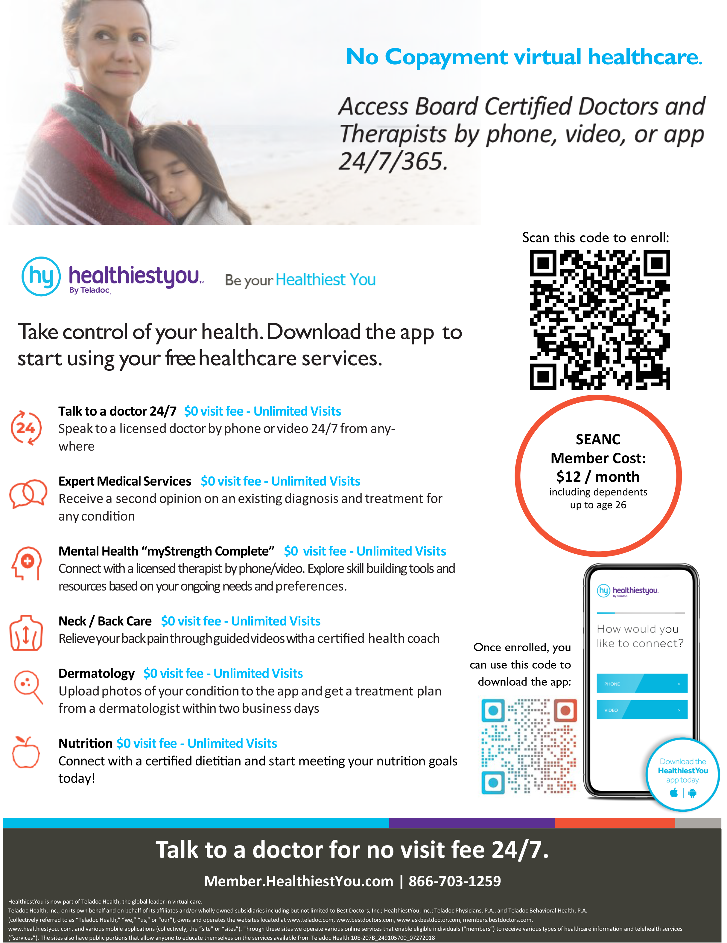 The SEANC Healthiestyou product by Teladoc offers 24/7 access to a licensed doctor via phone or video app. It also includes access to Expert Medical review, dermatology, nutrition, and mental health services, all for a $0 copay.