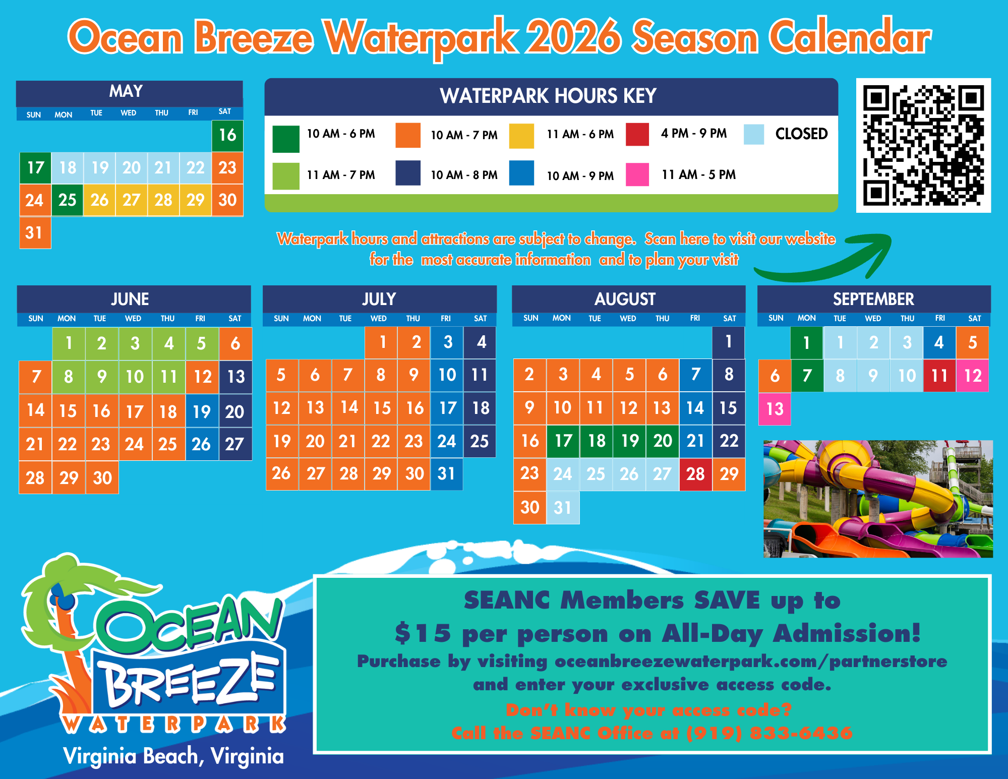 Please contact the SEANC Office to purchase tickets for Ocean Breeze Waterpark at 1-800-222-2758.
